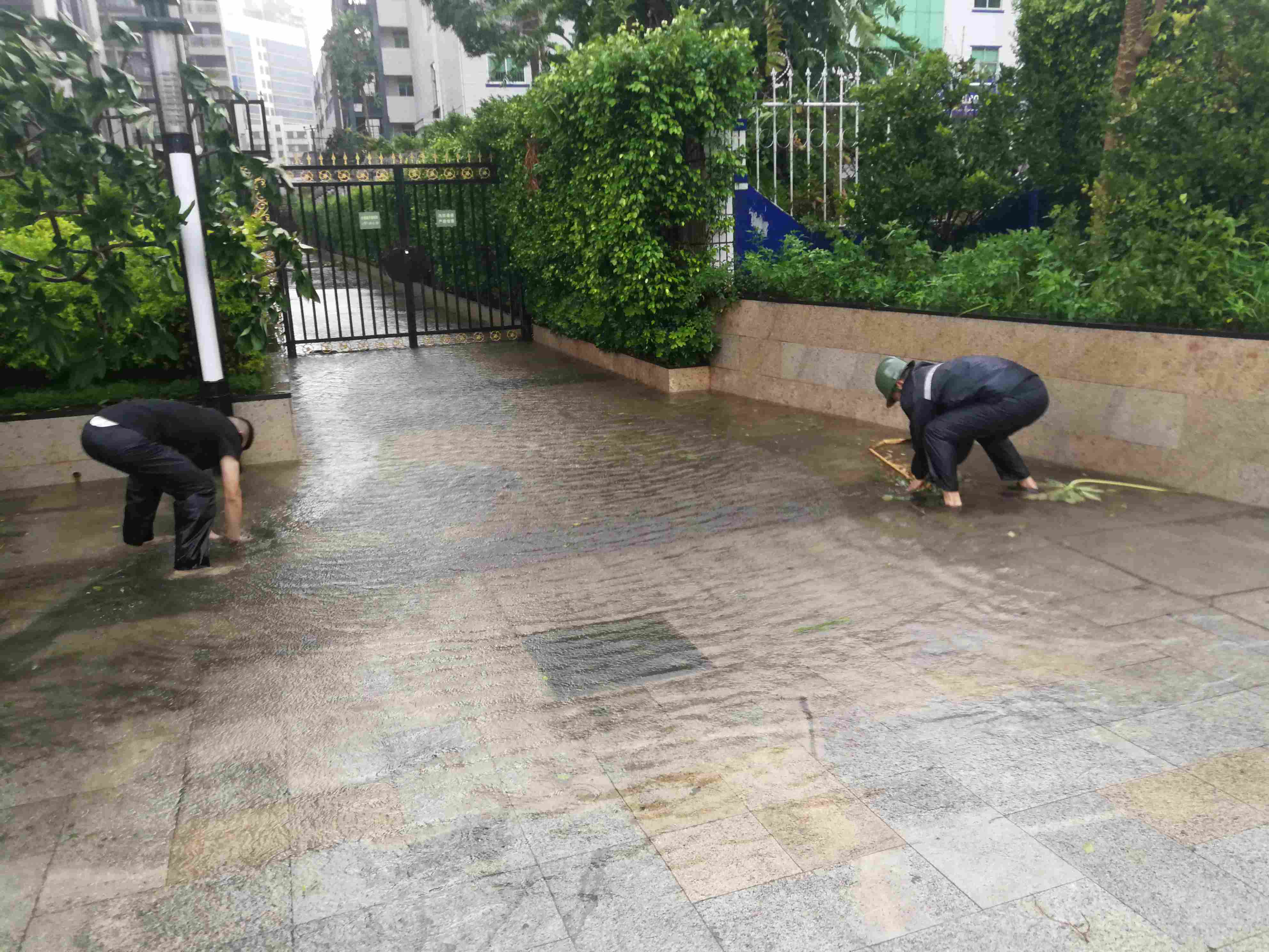 工程人員認(rèn)真檢查小區(qū)的設(shè)施設(shè)備,確保設(shè)備的正常運(yùn)轉(zhuǎn)。綠化人員修剪大樹枝杈,為小區(qū)綠植加固。保潔人員逐點(diǎn)檢查清理排水溝和沙井口、天面、下水道等。安全員在地庫(kù)口等主要位置放置消防沙袋,隨時(shí)備用;巡查小區(qū)廣告牌等易被大風(fēng)吹落傷人的危險(xiǎn)物品,對(duì)其進(jìn)行加固和搬離;物業(yè)工作人員不間斷地在小區(qū)無(wú)縫巡邏,發(fā)現(xiàn)險(xiǎn)情及時(shí)處理。在風(fēng)雨中,管理處工作人員不畏艱險(xiǎn),堅(jiān)守崗位,堅(jiān)持巡查主要排水口,隨時(shí)清理堵塞的排水道口,及時(shí)排除小區(qū)安全隱患,確保小區(qū)安全。